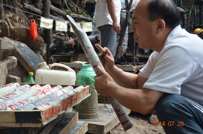 該項(xiàng)目是我隊(duì)繼小秦嶺整裝勘查潼關(guān)自有礦權(quán)區(qū)中深部探礦系統(tǒng)工程之后的又一探礦項(xiàng)目。在總公司領(lǐng)導(dǎo)的關(guān)心支持下,隊(duì)主要領(lǐng)導(dǎo)非常重視,多次前往項(xiàng)目實(shí)施地進(jìn)行現(xiàn)場檢查指導(dǎo)。目前,項(xiàng)目相關(guān)手續(xù)辦理及鉆探施工正有序進(jìn)行,總體進(jìn)展順利,鉆孔不同深度見有多層礦化。在檢查ZK503提取的巖心時(shí),王隊(duì)長手持地質(zhì)放大鏡仔細(xì)查看,他要求施工和相關(guān)技術(shù)人員要隨時(shí)注意巖心變化情況,特別對(duì)不同標(biāo)高段出現(xiàn)的不同地質(zhì)情況要認(rèn)真記錄、仔細(xì)分析、及時(shí)報(bào)告,不能漏掉任何細(xì)節(jié)。