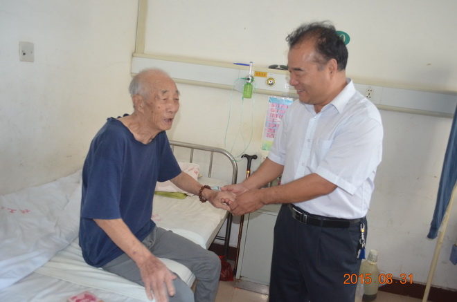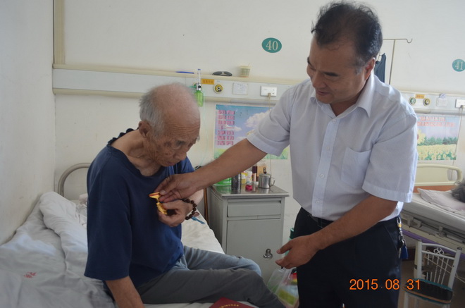 在臨潼417醫(yī)院病房,黨委書記與抗戰(zhàn)老兵阮恩紀一起回憶革命戰(zhàn)爭時期的崢嶸歲月和中國共產(chǎn)黨走過的光輝歷程,同時還關(guān)切地詢問他的病情及康復(fù)情況,囑咐他要積極配合醫(yī)生治療、保重身體。