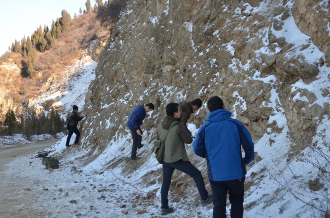 驪山梁上積雪未消,隊員們冒著零下3℃的低溫認(rèn)真的測量地質(zhì)剖面。他們分工明確,有人拉皮尺,有人定巖性,有人管記錄。寒風(fēng)吹過參賽隊員的臉頰,他們毫無知覺,一心一意專注于比賽之中。擂臺之上比速度,實戰(zhàn)之中看技能,這樣的比賽場面,也展示著地質(zhì)隊員精益求精的工作態(tài)度。