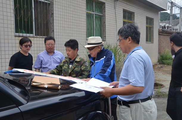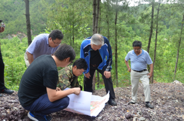 下午二點左右,老部長一行在劉曉東隊長和總工白和的陪同下到達洛南縣石門鎮(zhèn)項目部駐地,雖然年近八旬,但精神矍鑠,神采奕奕,不顧鞍馬勞頓,即讓技術人員將圖紙攤在了汽車引擎蓋上,聽取了隊長劉曉東、總工白和對商洛地區(qū)紫瑪瑙玉石礦賦存情況及全省寶玉石礦調查工作進展的匯報。