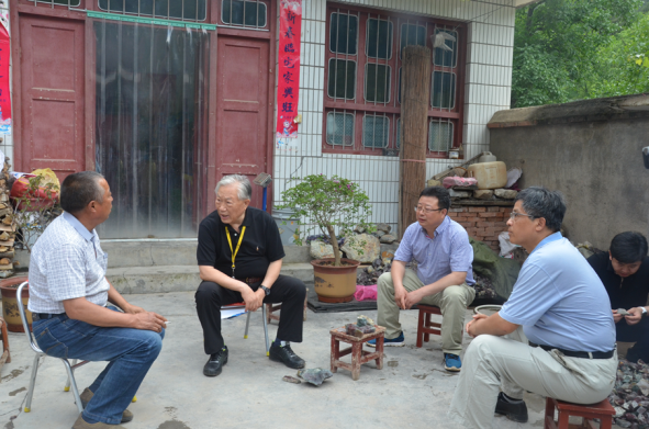上山察看后,老部長又來張華溝礦點劉吉村村民王新海的院子,察看了當?shù)卮迕耖_采的瑪瑙礦石,調研瑪瑙石礦民采情況,并在村民院子,饒有興趣的與我隊寶玉石礦項目部技術人員和村民進行了交流,關切地詢問技術人員的數(shù)量、生活及車輛租用費用等情況。項目負責高虔認真地一一回答了老部長的問詢。