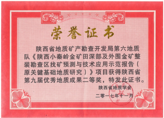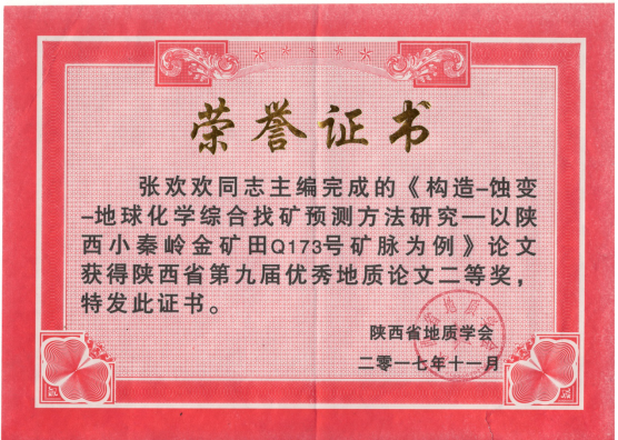 由我隊(duì)編制完成的“陜西省小秦嶺金礦田深部及外圍金礦整裝勘查區(qū)找礦預(yù)測(cè)與技術(shù)應(yīng)用示范(原關(guān)鍵基礎(chǔ)地質(zhì)研究項(xiàng)目)報(bào)告”獲陜西省第九屆優(yōu)秀地質(zhì)成果二等獎(jiǎng);該隊(duì)地質(zhì)調(diào)查所張歡歡同志撰寫(xiě)的“構(gòu)造-蝕變-地球化學(xué)綜合找礦預(yù)測(cè)方法研究—以陜西小秦嶺金礦田Q173號(hào)礦脈為例”一文獲優(yōu)秀地質(zhì)論文二等獎(jiǎng)。