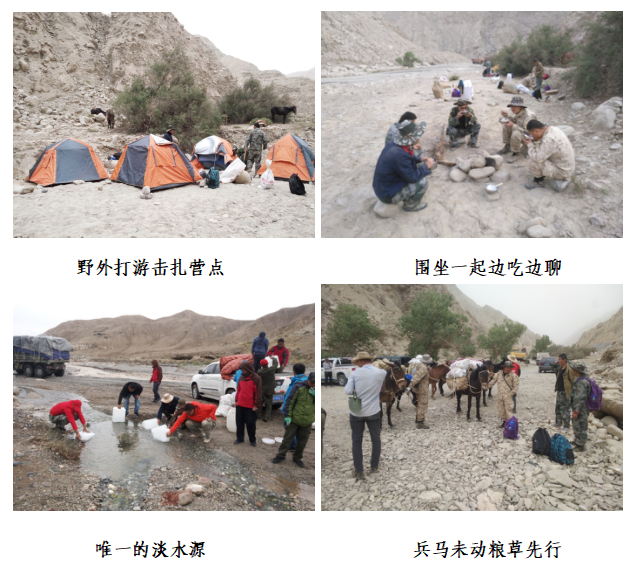 由于工區(qū)面積較大,采樣難度因地形所限超乎預(yù)期,許多地方不能當(dāng)天返回駐地,我們只能采用“打游擊”(騾子馱帳篷,走哪住哪)的方式進行。于是茫茫阿爾金山便是我們的床,浪漫星空便是我們的被,與阿爾金山野驢為伴,別說還真有點野性。然而吃飯卻是最大的問題,自帶的淡水僅能維持兩日,后面的日子就只能用燒開的咸水煮方便面、下掛面,或者索性用馕充饑。為了能按時完成任務(wù),項目人員餐風(fēng)沐雨,齊心協(xié)力,從不叫苦。