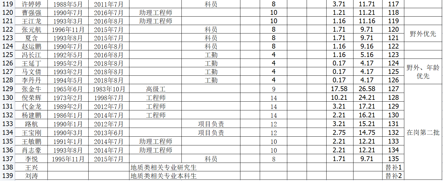 截至2021年底,我公司現(xiàn)有在冊職工421人,其中事業(yè)身份373人,企業(yè)身份48人。在崗職工182人,下崗及內(nèi)退239。各類專業(yè)技術(shù)人員116人,其中地質(zhì)類專業(yè)技術(shù)人員83人,其他專業(yè)技術(shù)人員33人。教授級高工1人,高級工程師22人,工程師41人;初級及以下52人,管理人員16人,工人289人,其中技師15人。